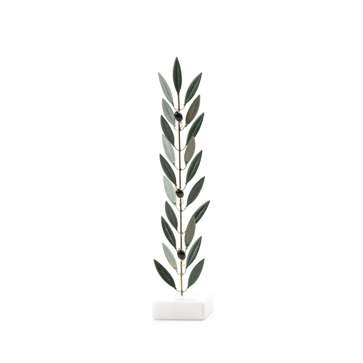 Χειροποίητο διακοσμητικό κλαδί ελιάς αποτελείτε από εικοσιένα ορειχάλκινα (μπρούτζινα) φύλλα και κεραμικές ελιές.