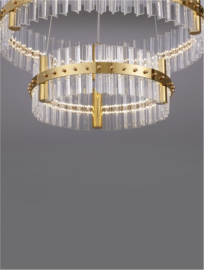 Material: Clear Structured Glass & Brushed Gold Steel Bulb Type: LED G9 5x5 Watt 230 VoltIP20 Bulb Excluded Category: MODERN PENDANT GLASS LUMINAIRES Dimensions: D: 42 H: 180 cm